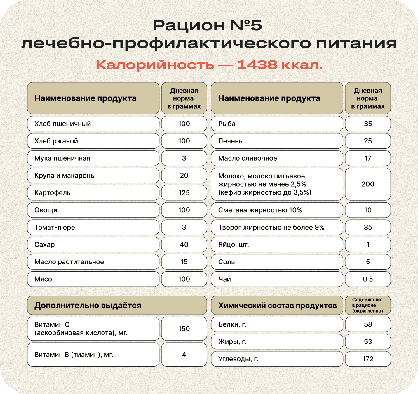 Помимо блюд, работникам могут дополнительно выдавать витамины. К примеру, для рациона № 5 предусмотрена выдача аскорбиновой кислоты и тиамина