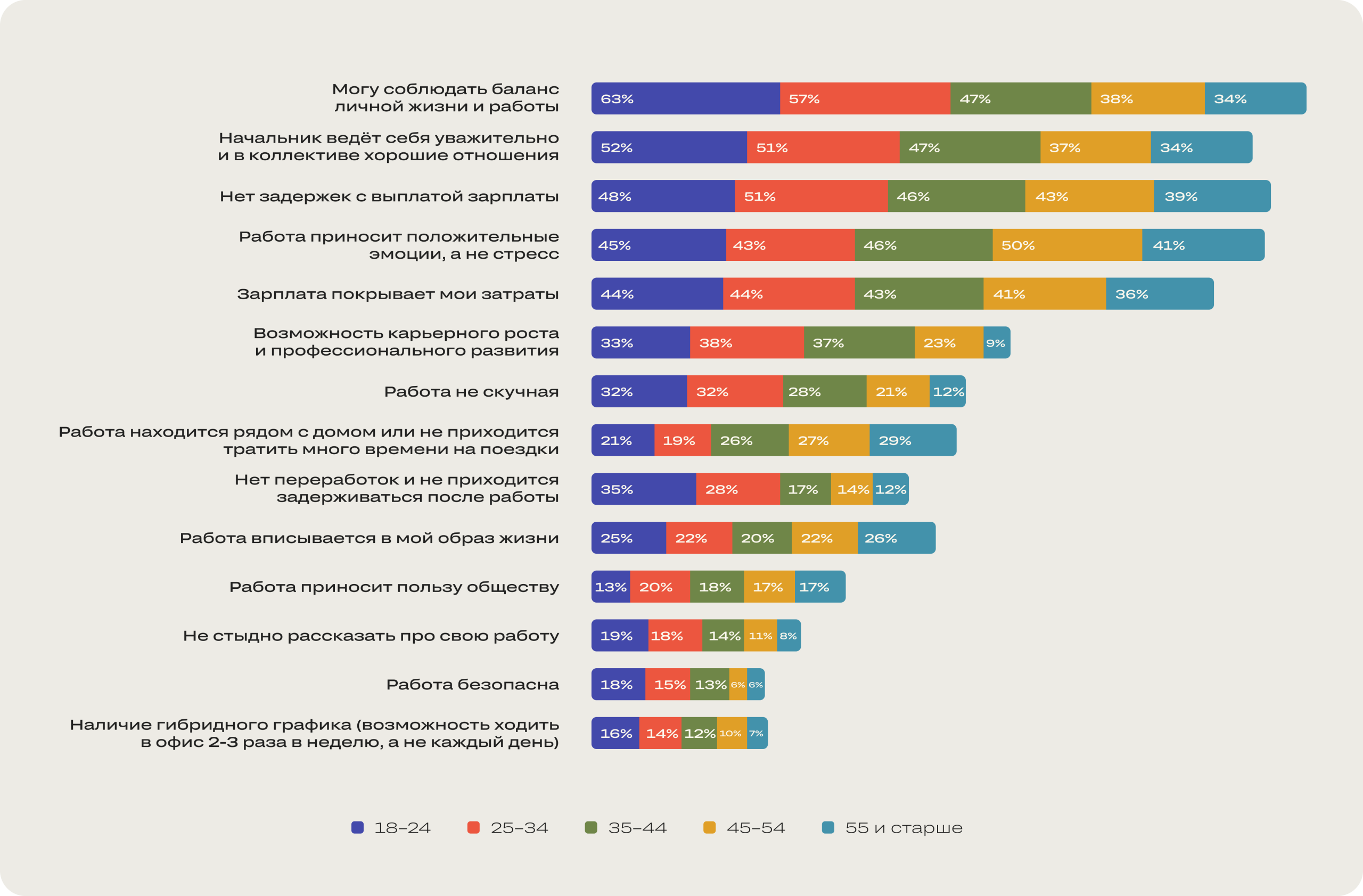 Опрос HH.ru показывает: молодые сотрудники до 24 лет в первую очередь хотят баланс работы и личной жизни и уважительное отношение в коллективе. В возрасте 35–44 лет на первый план выходят стабильная зарплата и положительные эмоции от работы. А для работников старше 45 лет особенно важно местоположение офиса и экономия времени на дорогу
