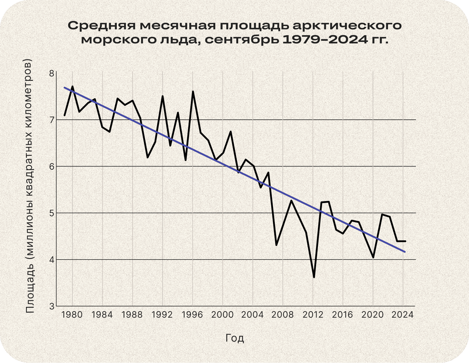 Тренд сокращения остаётся устойчивым: за последние 45 лет площадь льда уменьшилась почти вдвое, и рекордно низкие значения повторяются регулярно
