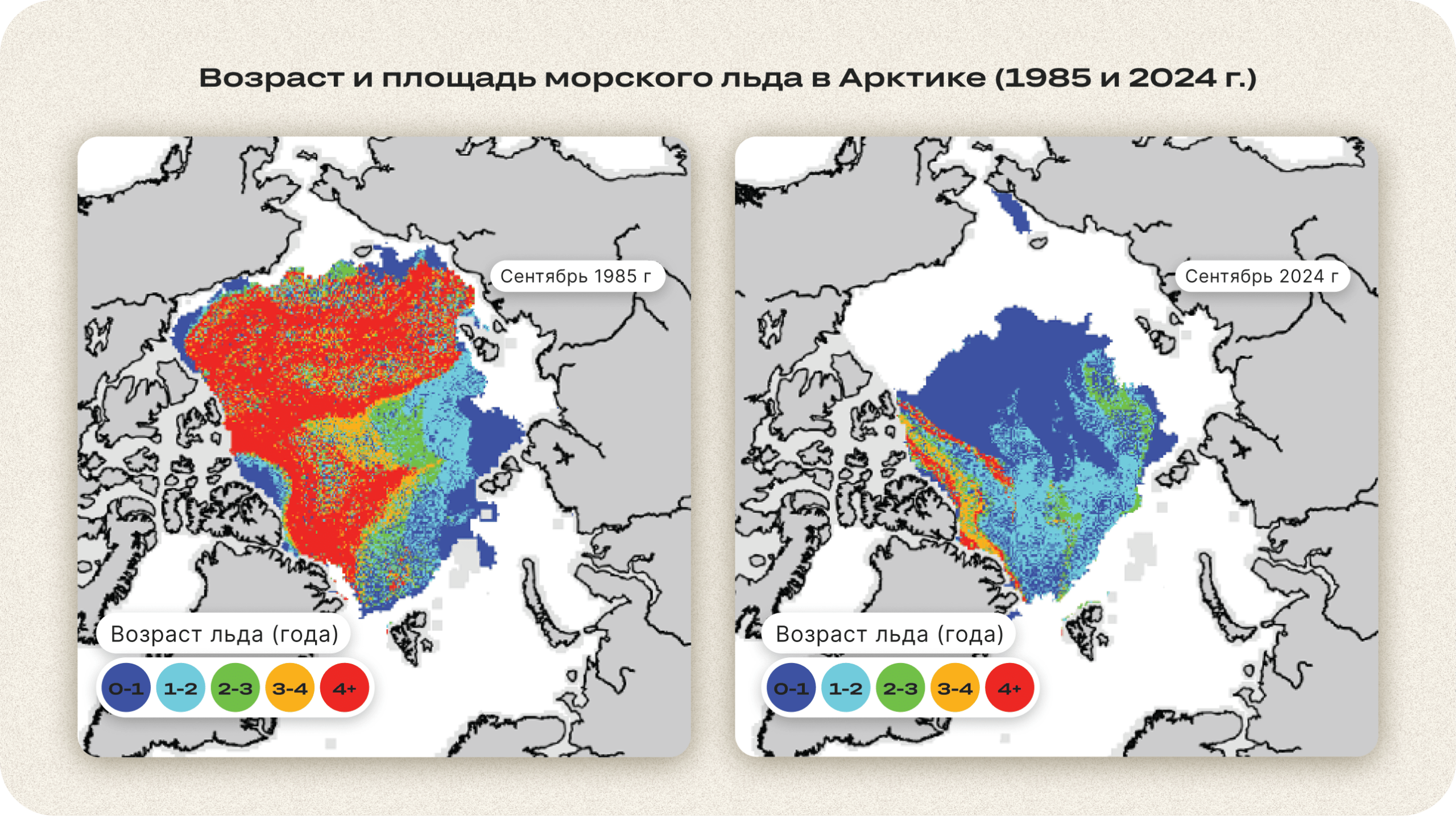 За 40 лет общая площадь льда заметно сократилась, а старый многолетний лёд почти исчез — его место занял тонкий молодой лёд возрастом 1–2 года