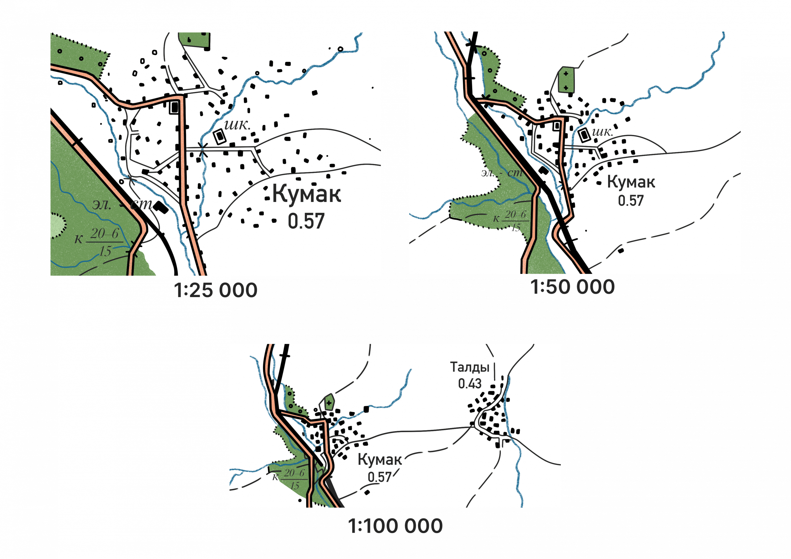 - Для коротких маршрутов в сложной местности лучше брать карты с масштабом 1:25 000 или 1:50 000.