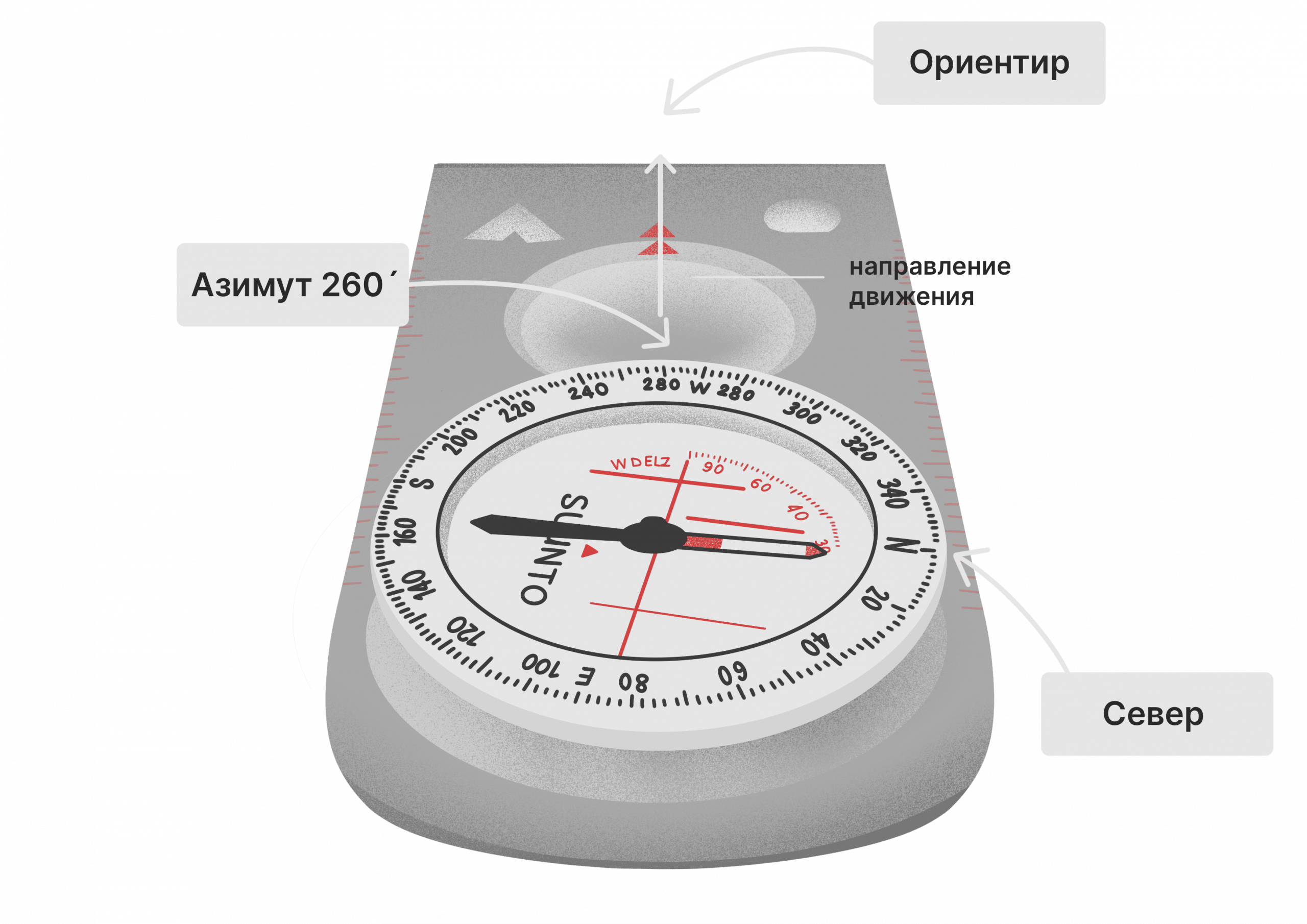 Чтобы определить азимут, наведите компас на цель и поверните шкалу так, чтобы отметка N (север) совпала со стрелкой. Запомните значение. Перед началом движения держите компас перед собой и убедитесь, что стрелка совпадает с N; если нет — поверните корпус тела до совпадения. Посмотрите вперёд по линии направления на корпусе компаса и двигайтесь по ней, периодически контролируя направление. Зная азимут, вы сможете определить, в какой стороне находится объект, даже если он пропадёт из поля зрения