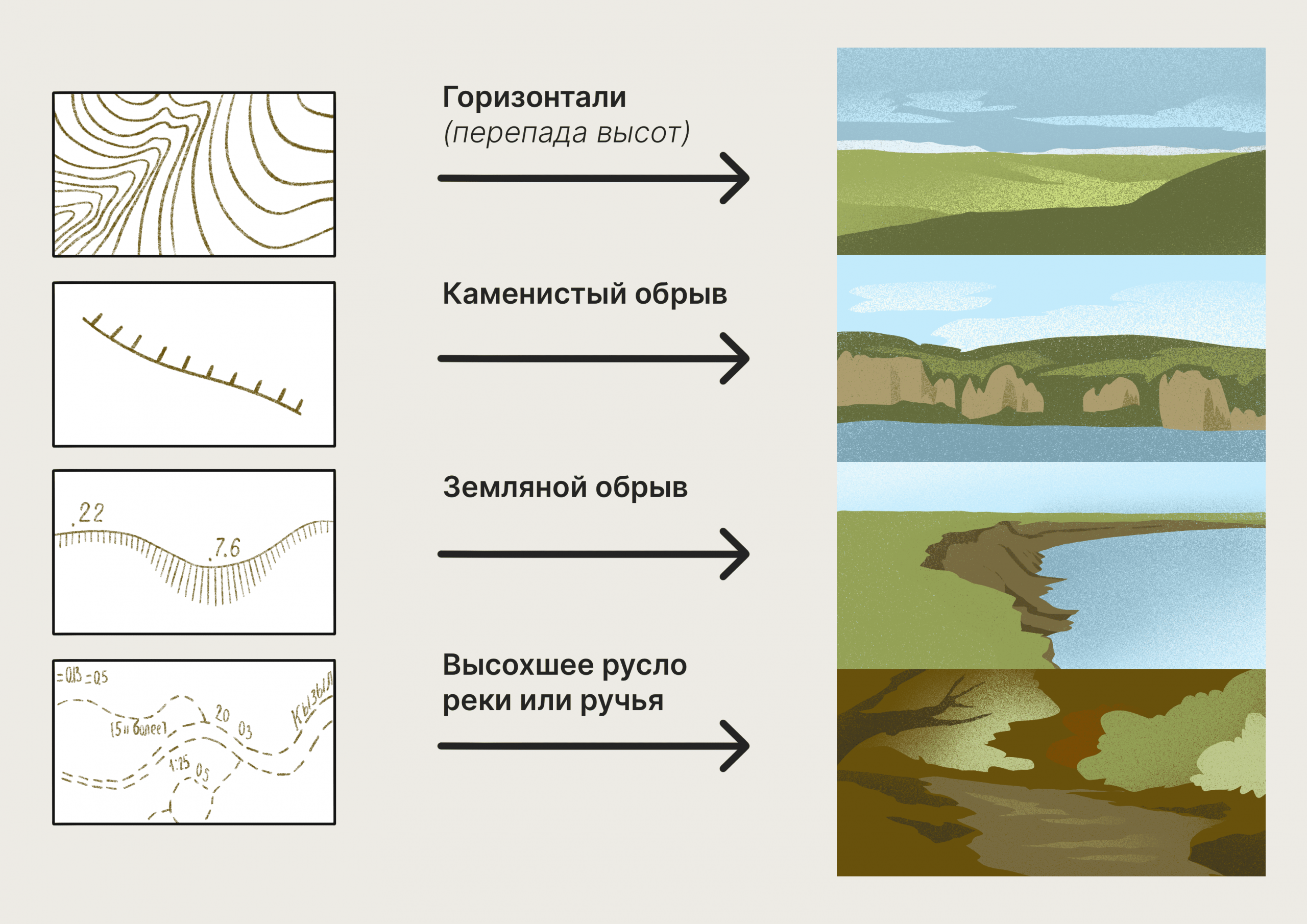 Ориентиры должны быть одновременно и в реальной местности, и на карте. Если вы видите гору, но её нет на карте, она бесполезна для навигации